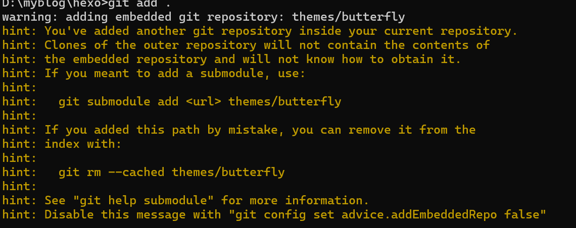 克隆的文件里themes文件并没有克隆,需要我们自己手动克隆,可以从主题官方处克隆,我这里用的是butterfly主题:git clone -b dev https://github.com/jerryc127/hexo-theme-butterfly.git themes/butterfly